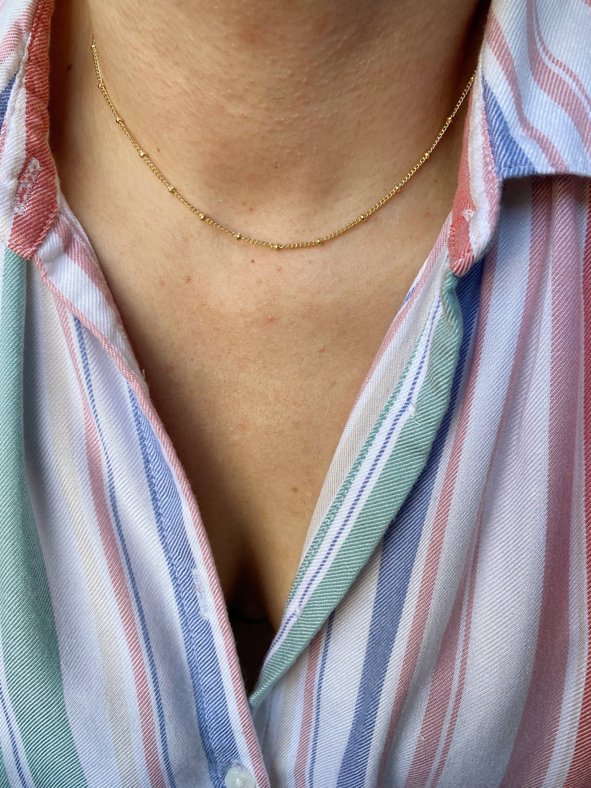 So delicate and gorgeous 1mm Satellite Chain in 18k gold filled. Featuring little A great wildcard product where you can match with any pendant or charm.