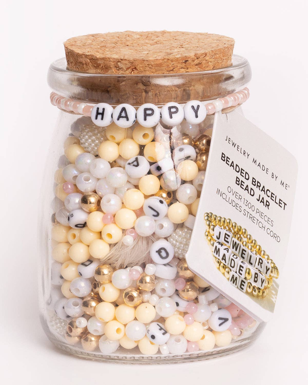 HAPPY white with black letters round alphabet beads and accompanying monochromatic spacer beads to make your own custom stretch beaded word bracelets. Giftable and reusable glass bead jar DIY kit also comes with neutral toned beads in a range of sizes and shapes including seed beads and round spacers in iridescent whites, cream, beige, metallic gold, and soft pink. Includes 5 yards of clear stretch elastic cord.