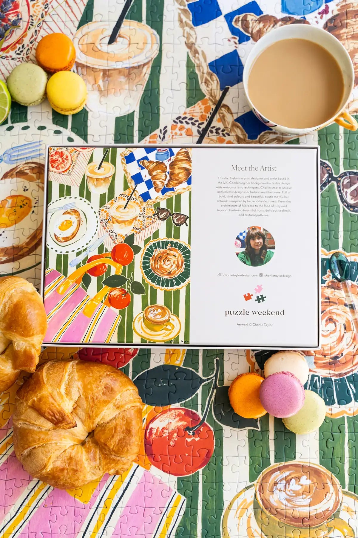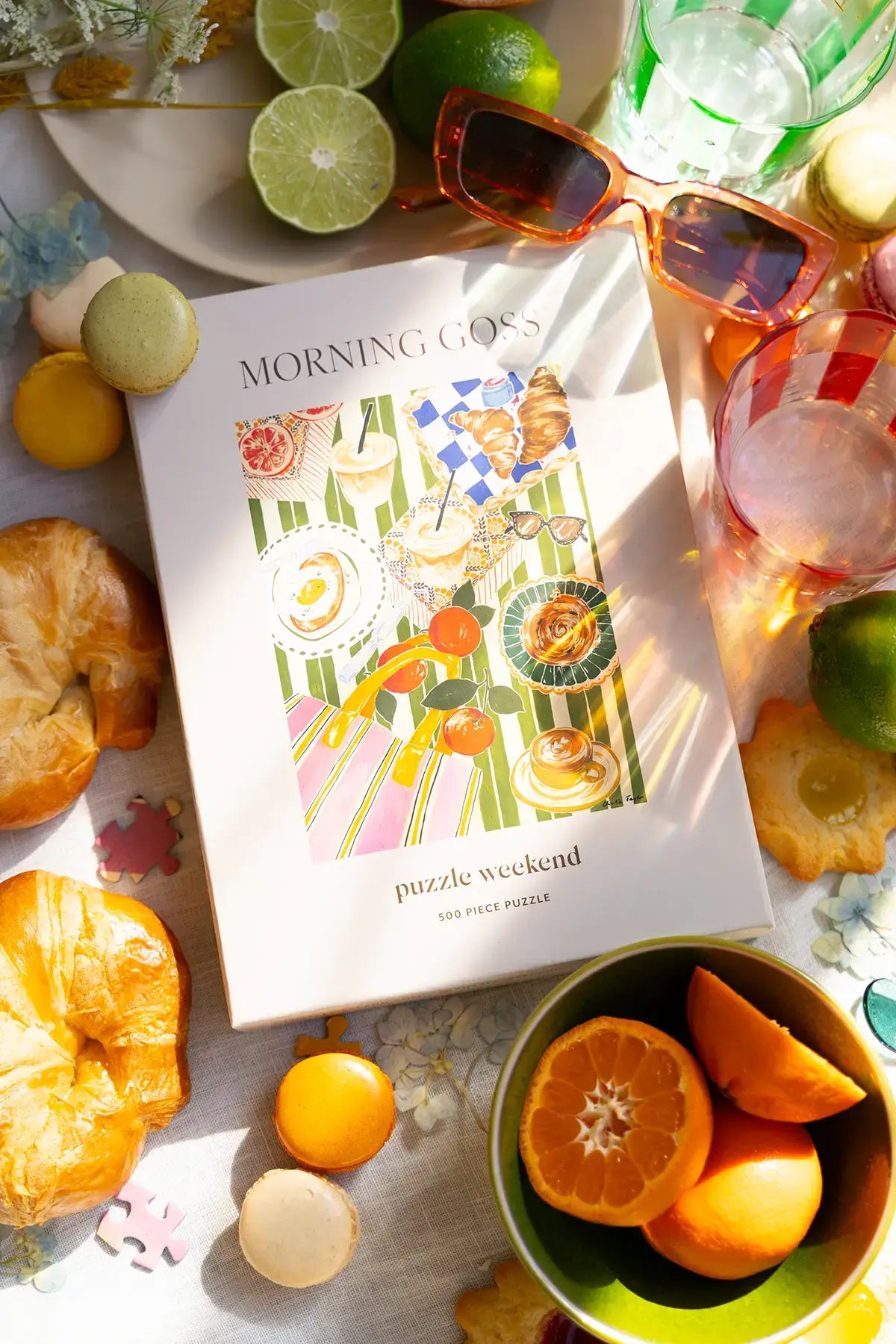 Weekends are for coffee and croissants, with a side of hot goss! This 500 piece puzzle, illustrated by textile print designer & artist Charlie Taylor, puts brunch and buzz together - just as they belong. Made with thick blue puzzle board, this cute puzzle features a satisfying satin matte finish. Whether you and your crew prefer to sip or spill the tea, Morning Goss is perfect if you’re looking for foodie gifts, gifts for coffee lovers, or the ultimate little treat to keep for yourself.