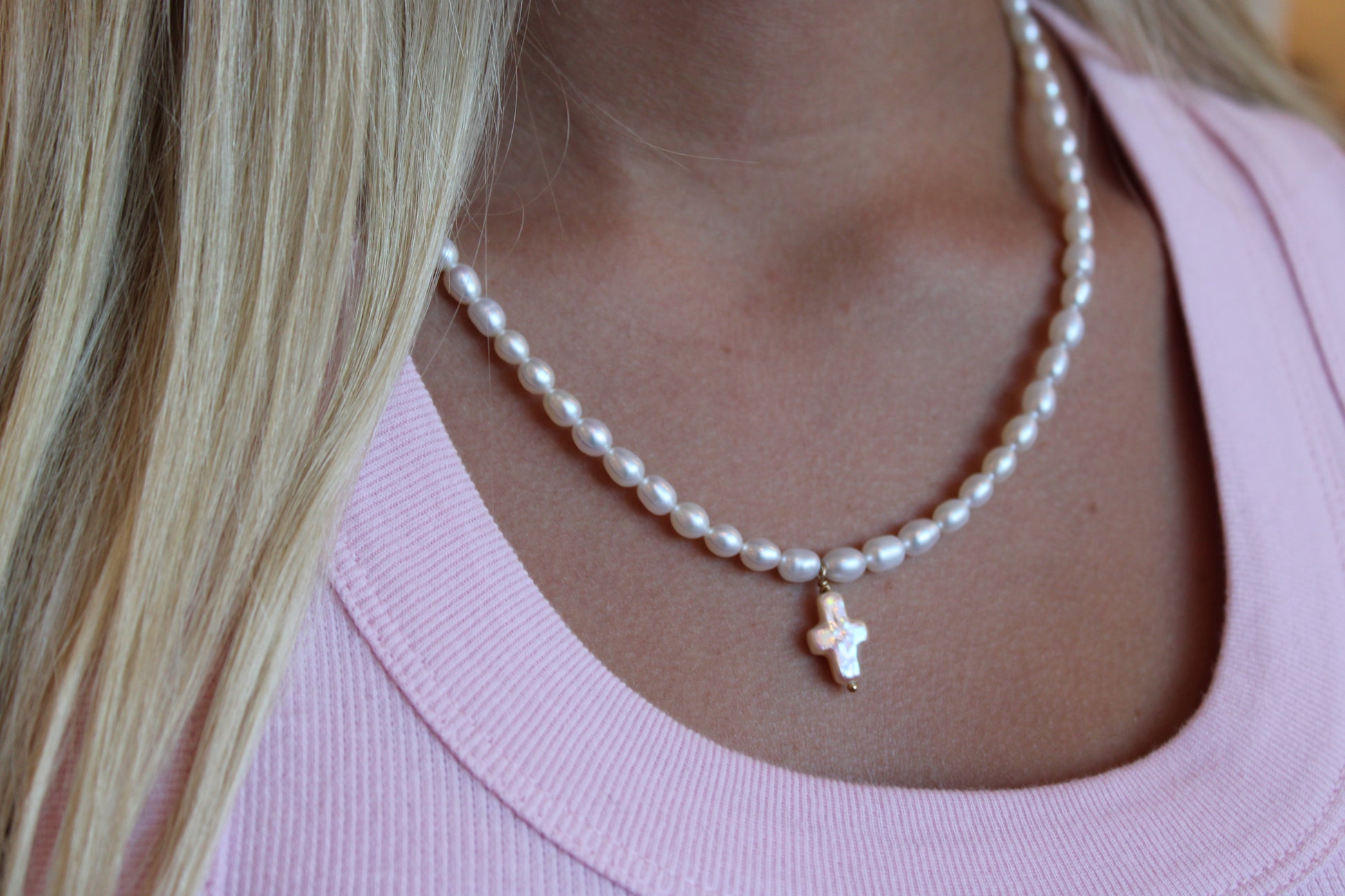 White freshwater pearls with a freshwater cross pearl as a pendant. 18”. Message us if you would like to order this in .925 sterling silver!